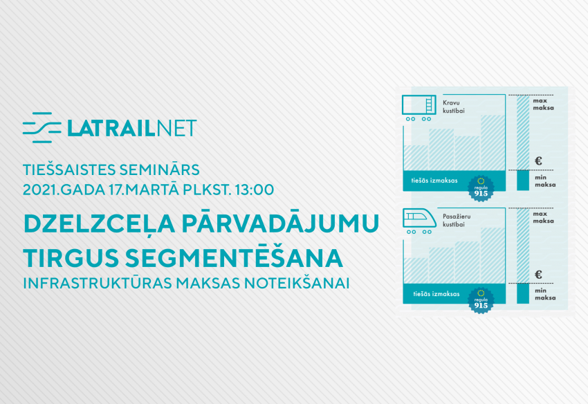 Ar vairāk nekā 60 transporta nozares profesionāļu un interesentu piedalīšanos 2021.gada 17.martā tika aizvadīts AS “LatRailNet” rīkotais informatīvais tiešsaistes seminārs par dzelzceļa pārvadājumu tirgus segmentēšanu infrastruktūras maksas noteikšanai. Semināra dalībnieki tika iepazīstināti ar dzelzceļa pārvadājumu tirgus segmentēšanas tiesisko ietvaru, segmentēšanas procesu, vērtēšanas galvenajiem kritērijiem, kā arī tika skaidrota tirgus segmentu pieteikšanas un izskatīšanas kārtība.