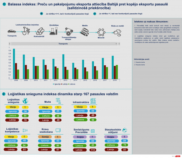 Balassa indekss norāda produkta tirdzniecības aktualitāti pasaules eksportā un salīdzina valsts konkrētā produkta eksportu ar kopējo pasaules eksportu. Uzskatāms, ja indekss ir lielāks par 1, tad valsts specializējas konkrēta produkta eksportā un, jo lielāks ir indekss, jo labāka ir valsts veiktspēja. Savukārt, ja indekss ir mazāks par 1 tas nozīmē, ka šim produkta eksportam nav īpašas nozīmes. Šāda uzdevuma veikšanai ir nepieciešams salīdzināt transporta eksporta īpatsvaru Latvijas kopējā eksportā ar transporta eksporta īpatsvaru pasaulē. Infografikā tiek apskatīta preču un pakalpojumu eksporta attiecība Baltijas valstīs pret kopējo eksportu pasaulē tādās nozarēs, kā transports, lauksaimniecības izejvielas, kokmateriāli, ķimikālijas, transportlīdzekļu detaļas, metāls, minerāli, rūda un metāli.
