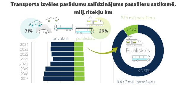 Privātais un komerciālais autotransports (piem. pasažieru pārvadājumi ar autobusiem) Latvijā apjoma ziņā pastāvīgi pārsniedz sabiedrisko transportu, veidojot aptuveni 71 % no kopējiem ritekļu kilometriem. Pēc Covid-19 pandēmijas novērojams būtisks privātā transporta lietošanas samazinājums, kas varbūt skaidrojams ar pārvadājumu paradumu maiņu un attālināta darba ieviešanu, tomēr, sākot ar 2022. gadu ir novērojama daļēja atkopšanās. Savukārt publiskajā transportā novērojams pakāpenisks, mērens pārvadājumu apjomu samazinājums, sekojot maršrutu samazinājumam demogrāfisko notikumu ietekmē.