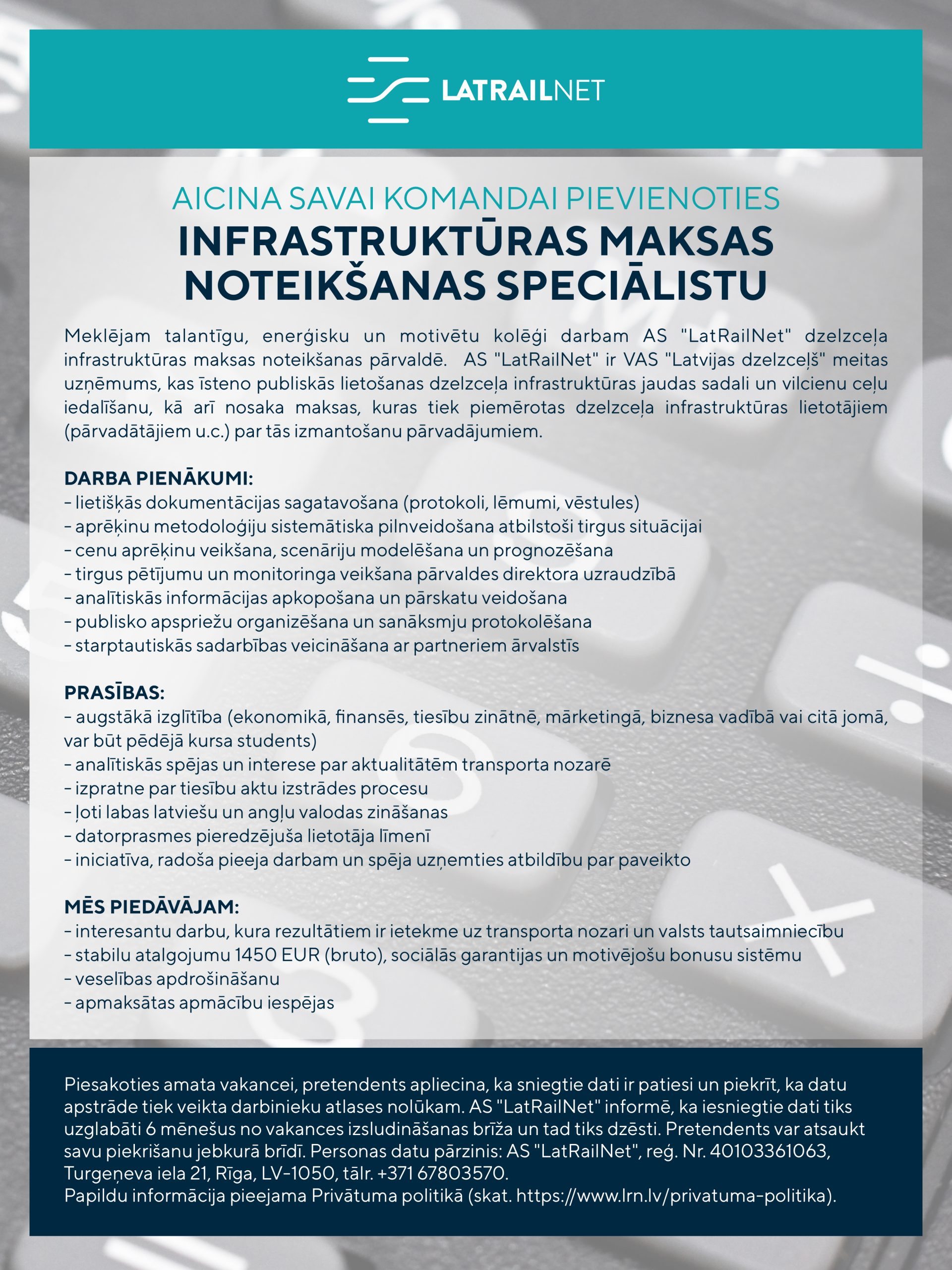 AS “LatRailNet” aicina savai komandai pievienoties talantīgu, enerģisku un motivētu kolēģi darbam speciālista amatā infrastruktūras maksas noteikšanas pārvaldē.