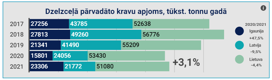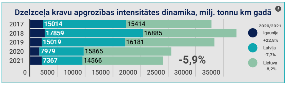 Analizējot pieejamos datus par dzelzceļa kravu apgrozību Baltijas valstīm secināms, ka pēdējos gados vērojama lejupejoša kravu apgrozības intensitātes dinamika jeb samazinājums par -5,9%. Latvijā dzelzceļa kravu apgrozība 2021.gadā Latvijā bija 7 367 milj. tonnkilometri, kas ir par -7,7% mazāk kā 2020.gadā. Attiecīgi kravu apgrozības samazinājums par -8,2% noticis Lietuvā sasniedzot 14 566 milj. tonnkilometru gadā. Savukārt Igaunijā, pēc piedzīvotā krituma 2020.gadā, dzelzceļa kravu kopējā apgrozība 2021.gadā palielinājās par +22,8% un sastādīja 2 124 tūkst. tonnkilometru[5].