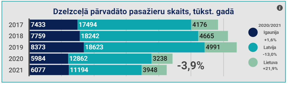 Apkopotie dati liecina, ka 2021.gadā dzelzceļa pārvadāto pasažieru skaits Baltijā kopumā ir samazinājies par -3,9%, pārvadāto pasažieru skaits pieaudzis Lietuvā un Igaunijā. Pa Latvijas dzelzceļa publiskās lietošanas infrastruktūru platsliežu dzelzceļa līnijās 2021. gadā pārvadāti 11 194 tūkst. pasažieri, salīdzinājumā ar iepriekšējo gadu to skaits ir samazinājies par 13%. Pārvadāto pasažieru skaita kritums saistīts ar ārkārtas situāciju un vilciena piepildījuma ierobežojumiem, kas 2021. gadā bija spēkā ilgāku laiku kā gadu iepriekš.